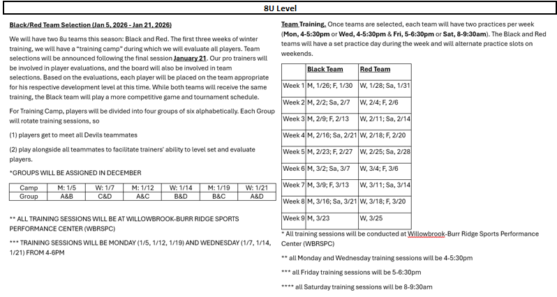 Each 8U-13U player will have two Devils practice sessions a week. One “age-level” practice at the Quarry Fieldhouse and one “team” practice at Willowbrook-Burr Ridge Sports Performance Center (WBRSPC).