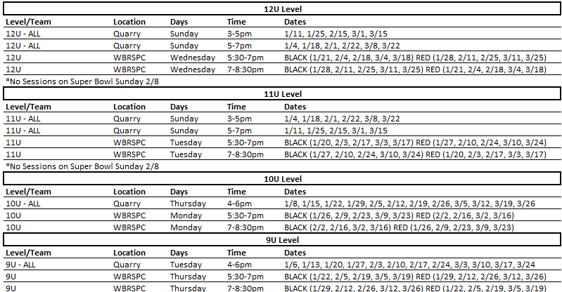 January 22, 2026 to March 26, 2026: Two Practices a Week - Two practices a week. One at the Quarry for the entire age group. The other practice for each specific team at the WBRSPC